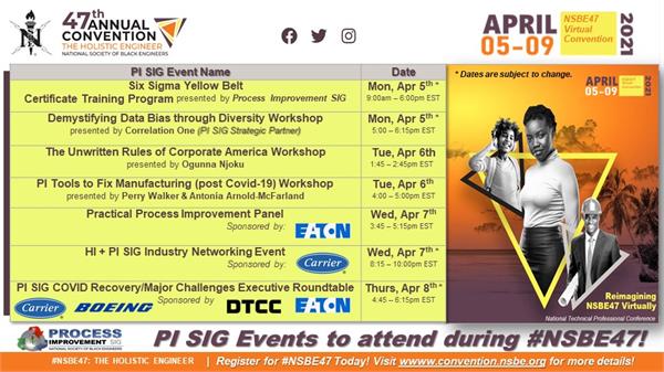 The NSBE Process Improvement SIG is proud to take part in NSBE's 47th Annual Convention. We would like for you to attend our events during this conference.